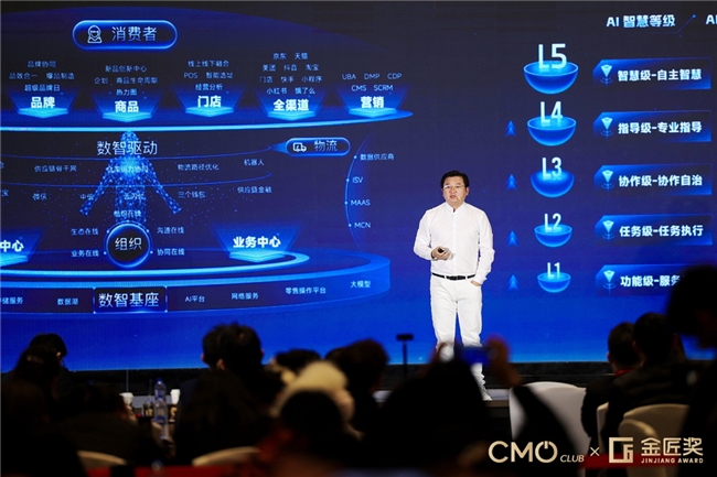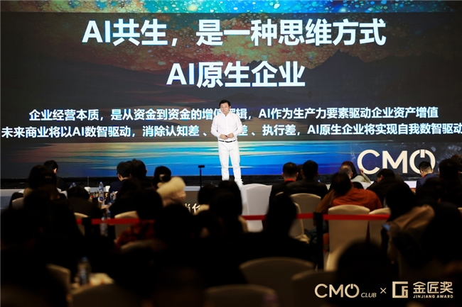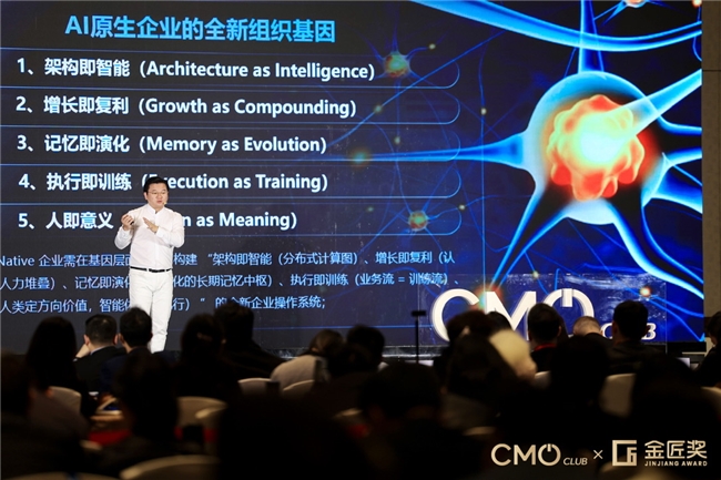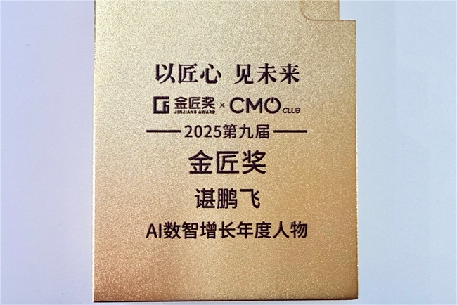 备受行业瞩目的第九届营销价值峰会暨金匠奖颁奖盛典在上海隆重举办,已经举办9年的金匠奖以“成就匠心品牌”为使命,在业界享有“营销界奥斯卡”的美誉。中国上市公司首位AI-CGO(首席数智增长官)谌鹏飞,凭借在AI数智增长领域的实战突破与行业引领性贡献,斩获第9届金匠奖获奖榜单全场最高特别奖:2025年度AI数智增长年度人物大奖。本届金匠奖11场主题演讲、3场主题对话、2大年度重磅报告发布。联想、腾讯、伊利、华住、绝味、喜力、锅圈、徐福记、施耐德等现场近500位CMO和行业专家与会。该奖项知名企业家、CMO、行业专家组成的权威评审团层层筛选、交叉验证产生,拒绝空洞概念、聚焦实效成果,是国内衡量数智增长领域个人专业能力的重磅荣誉。获奖后,谌鹏飞分享了一套经过实战验证的AI数智增长方法论,为传统企业家们指明了转型方向,其提出的“AI原生企业”组织基因、“企业AIOS战略”等核心观点,直击传统企业AI转型痛点,成为峰会最受关注的实战干货。